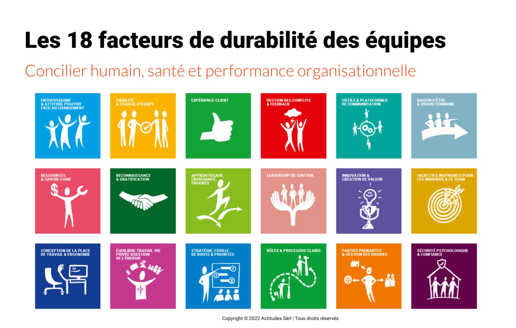 En travaillant avec les 18 facteurs clés, on permet aux équipes de renforcer leurs ressources et on contribue à les maintenir en bonne santé et à assurer leur bonne performance de manière pérenne.