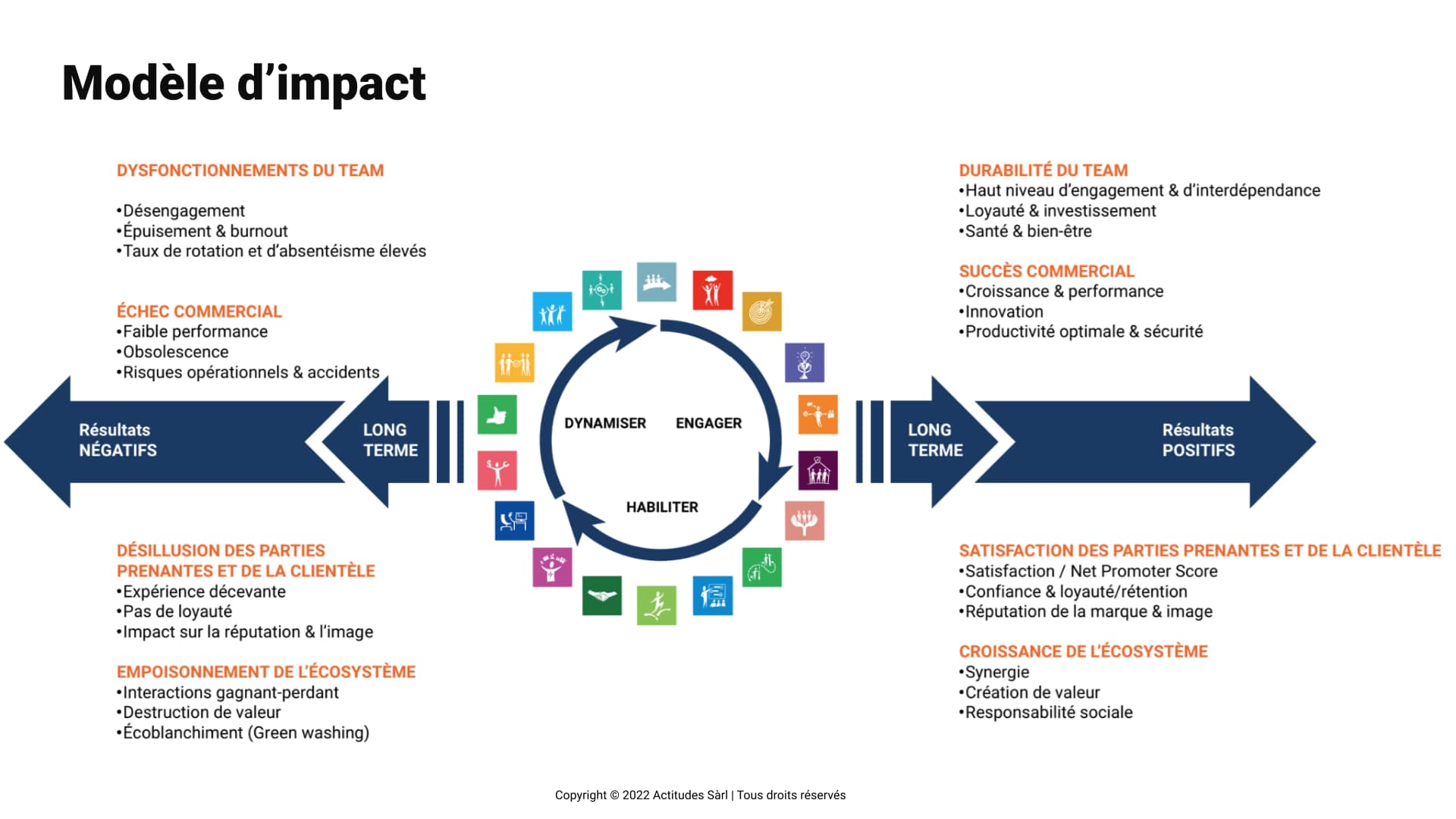 Le modèle d'impact que nous utilisons pour mettre en évidence l'impact coût - bénéfice lié au développement d'équipes durables est inspiré des modèles d'impact similaires utilisés en gestion de la santé et gestion de l'engagement et de la motivation en entreprise.
