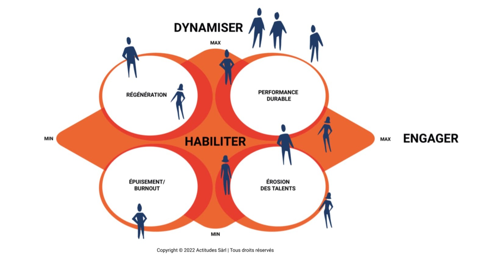 Cette gestion proactive va permettre d'amener l'équipe dans une zone de performance durable où les personnes se sentent pleinement habilitées, engagées et dynamisées par leur travail. Ça demande de créer une culture d'équipe qui valorise la notion de régénération comme étant une partie intégrale de la performance durable afin d'éviter le sur-engagement et l'épuisement qui caractérisent les zones d'érosion des talents et de burnout.